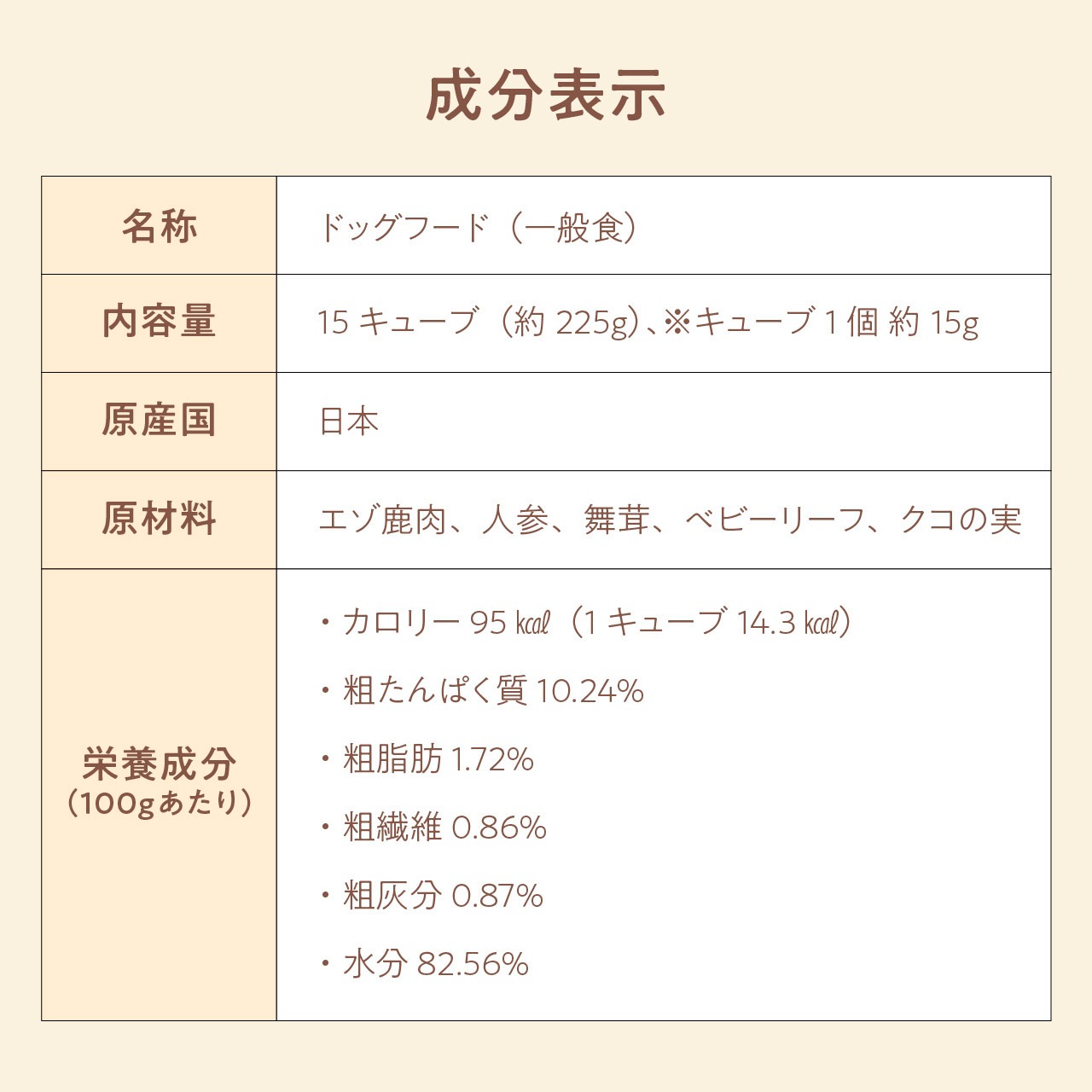 原材料:エゾシカ肉、人参、舞茸、ベビーリーフ、クコの実