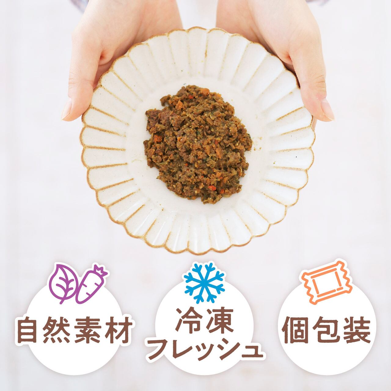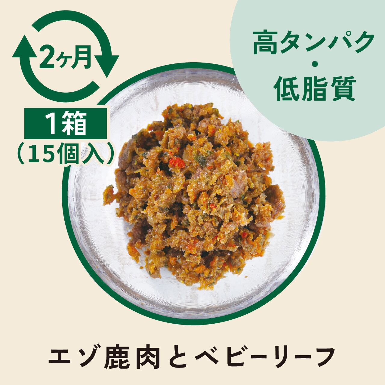 北海道産の天然エゾシカ肉と、自社有機農場で育てたベビーリーフに、国産野菜やこだわりの自然素材を加えて、無添加・冷凍・個包装で仕上げました。