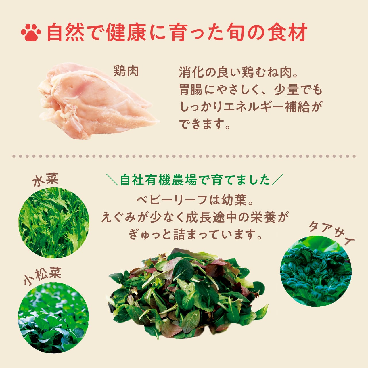 原材料:鶏肉、人参、かぼちゃ、おから、ベビーリーフ、クコの実