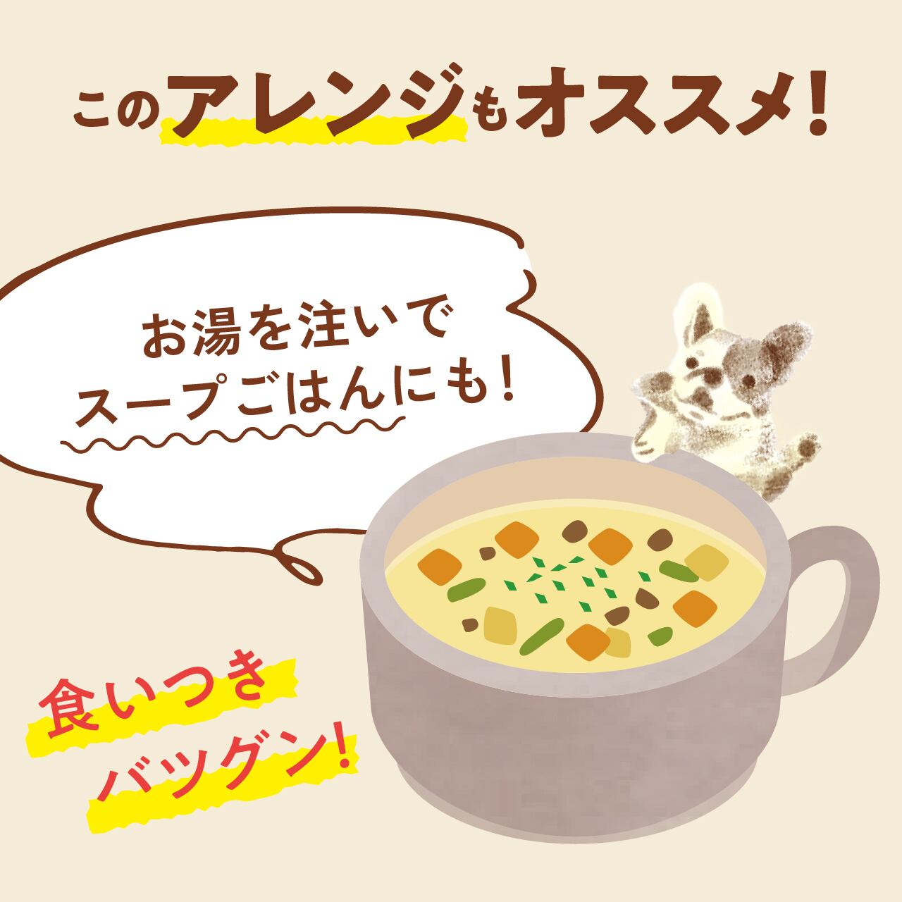 ・スープ仕立て:温めたキューブにお湯を注げば、簡単スープごはんに。