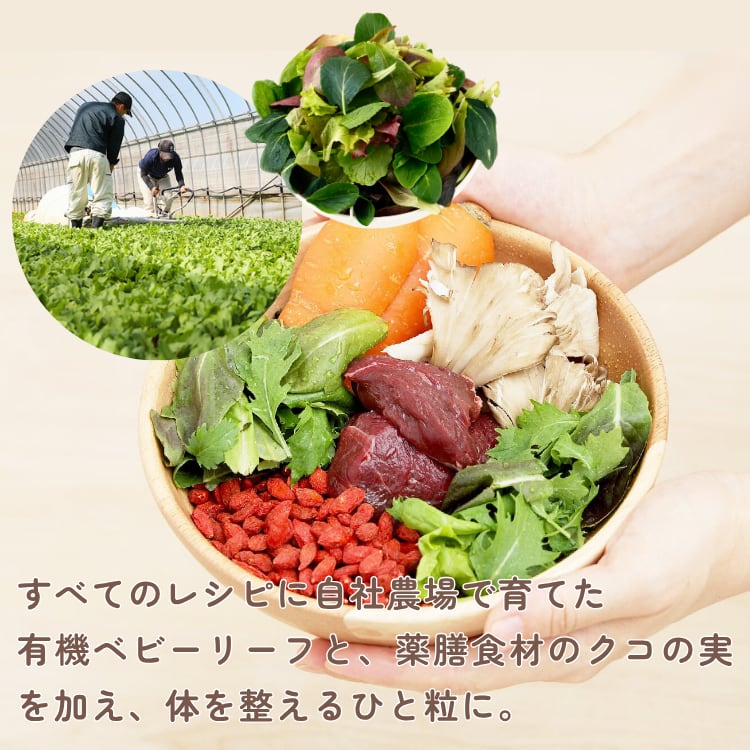 原材料:鶏肉、にんじん、かぼちゃ、おから、ベビーリーフ、クコの実